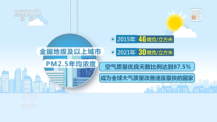 污染防治攻坚战持续打响,全国地级及以上城市PM2.5年均浓度由2015年的46微克/立方米降至2021年的30微克/立方米,空气质量优良天数比例达到87.5%,成为全球大气质量改善速度最快的国家。污染严重水体和不达标水体显著减少,2021年全国地表水水质优良断面比例达到84.9%。