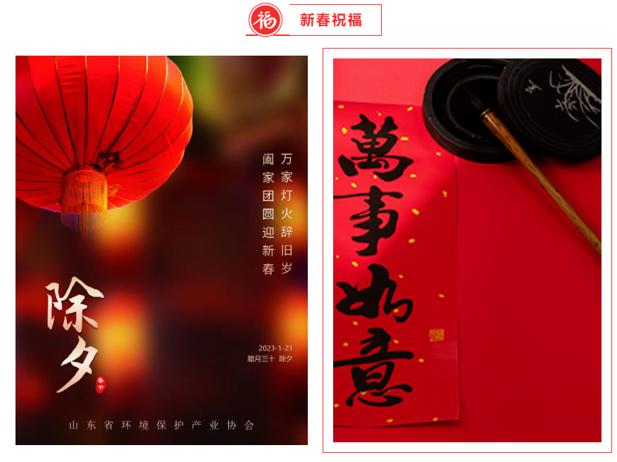 绿水青山风华壮,美丽中国又一春。值此四海同庆,共度佳节之际,山东省环境保护产业协会对一年来取得丰硕成果的广大环保企事业单位致以热烈的祝贺,对奋战在生态文明建设一线的生态环保产业全体同仁致以诚挚的问候,对关心和支持生态环保产业的各界人士表示衷心的感谢!祝大家新春快乐,万事如意!
