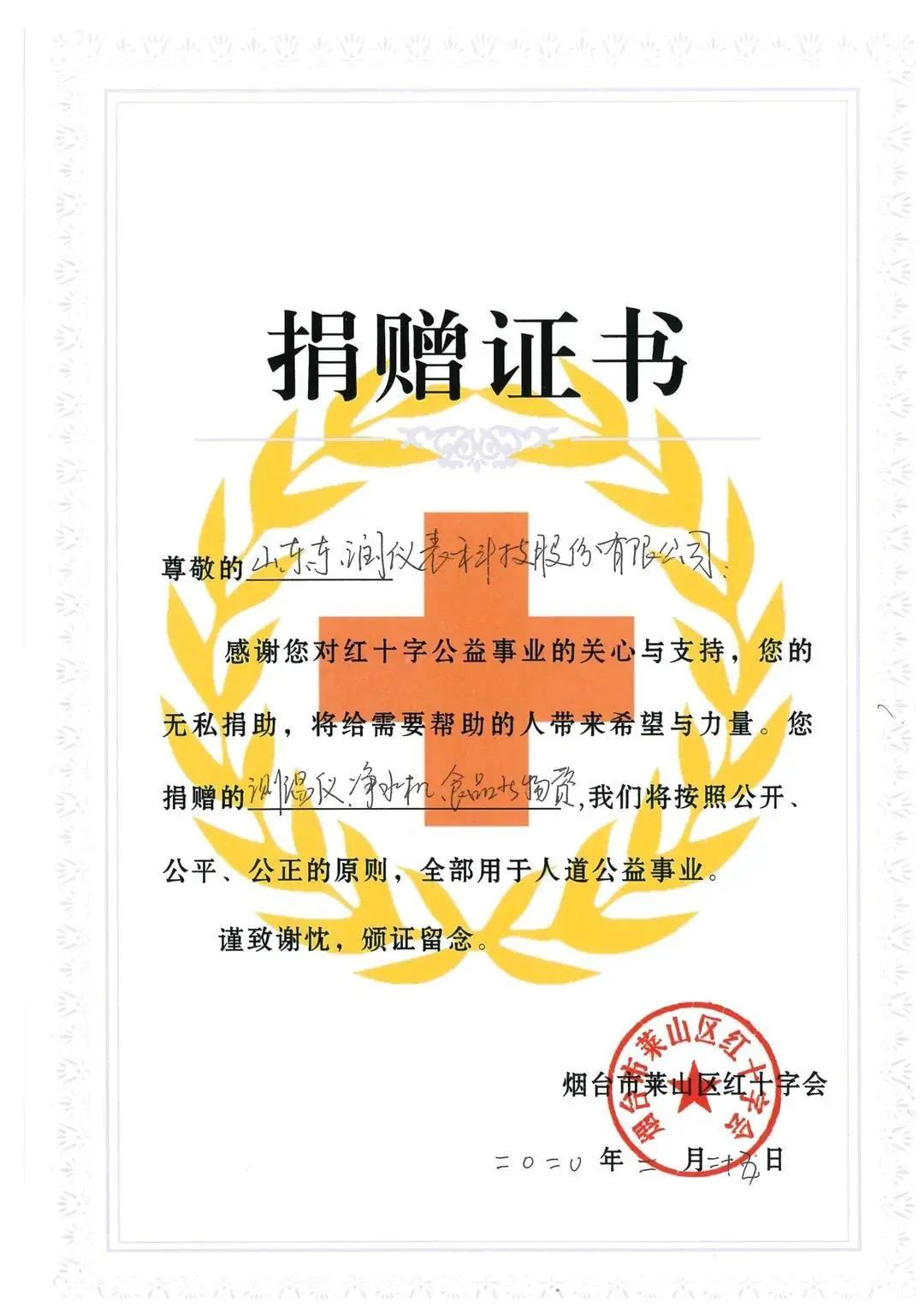 新冠肺炎疫情发生以来,东润仪表一直密切关注着疫情发展,心系湖北,公司从多方渠道购买了红外测温仪、净水器、即食粉丝等价值三十万元的物资,捐赠给烟台市莱山区红十字会,莱山区防疫指挥部将统一调配发往防疫一线使用。东润仪表董事长马正表示,后续将提供水质监测设备,持续为抗疫一线的白衣战士和抗疫工作贡献力量。